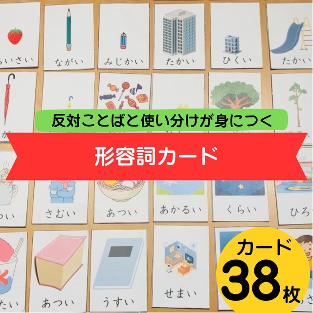 この絵カードは、幼児期に大切な 「おおきい・ちいさい」「あつい・つめたい」などの形容詞を、 比べながら学べる教材です。 それぞれの形容詞は、 「ぞうーりす」「メロンーいちご」のように 2種類ずつのペアカードで構成しています。 ちがう名詞と組み合わせることで、 形容詞がどんな言葉と一緒に使われるのかを自然に理解できます。 あそび方(一例) ① 「〇〇はどっちかな?」 2枚のカードを並べて、 「暑いのはどっちかな?」と聞いて選びます。 ② 「反対のことばはどれかな?」 4〜6枚のカードを並べて、 「『つめたい』の反対はどれかな?」と探します。 ③ 「○○より△△ごっこ」 「ぞうよりりすのほうが小さい」 「りんごよりスイカのほうが大きい」など、 2つを比べて言葉で説明する遊びも楽しめます。 この商品はデジタル商品です。 ご利用方法 ・A4用紙に印刷してください ・印刷後、厚紙に貼ると丈夫に使えます ・線に沿ってカットしてご使用ください